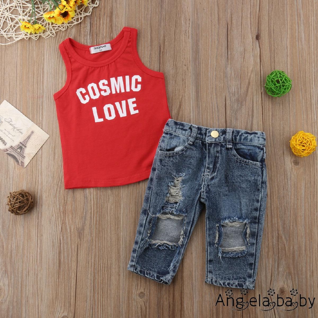 Giới thiệu Set áo thun cộc tay in chữ kèm quần jean dài rách gối cho bé gái