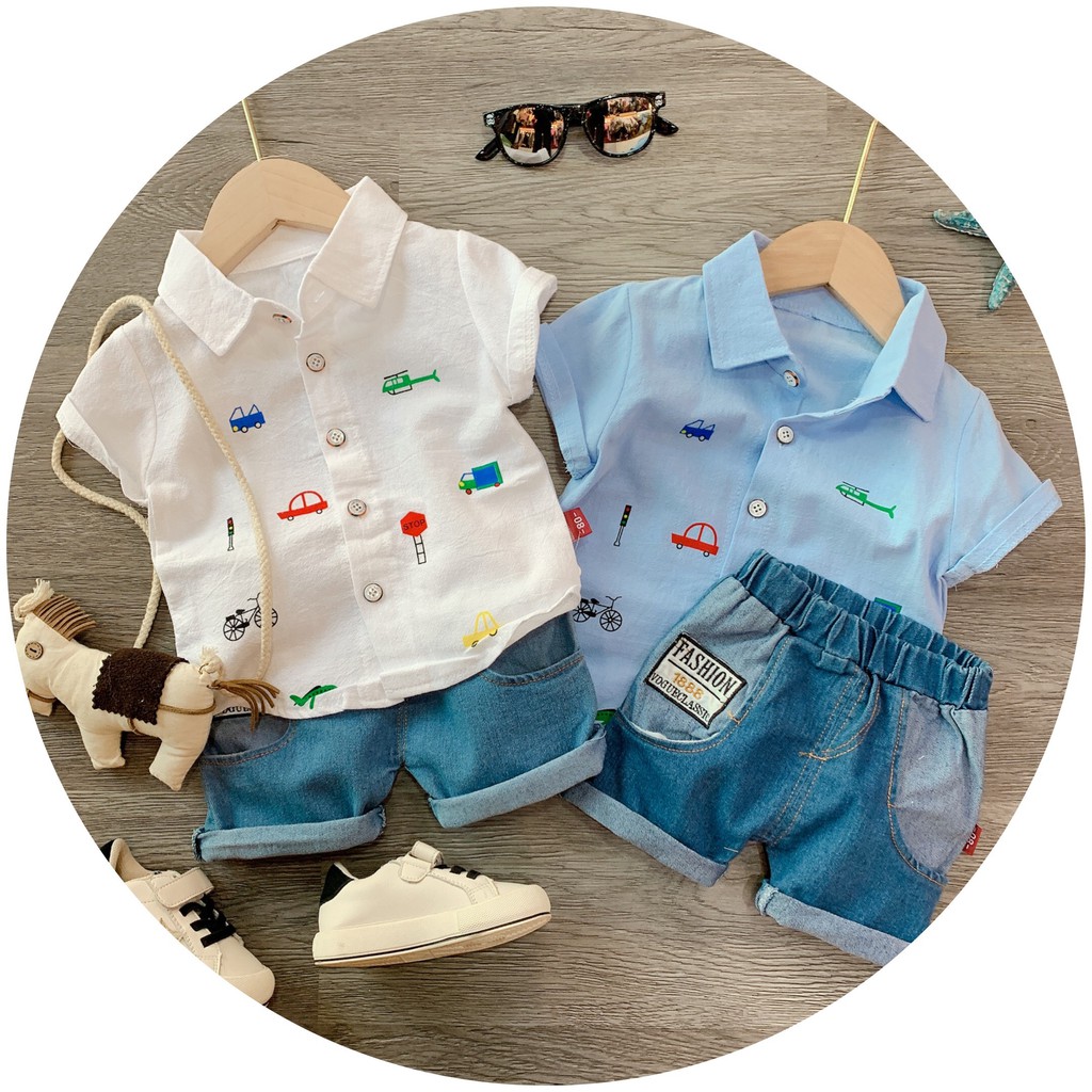 Thời Trang Trẻ Em > Bé trai | 5-14 tuổi > Set trang phục || Sét áo sơ mi hình Ô TÔ mix bò xanh bé trai