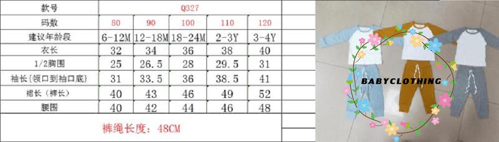 Size(cm) 80 Top Length: 32 Bust: 25 Pant Length: 40 Age: 6-12 Months 90 Top Length: 34 Bust: 26.5 Pant Length: 43 Age: 12-18 Months 100 Top Length: 36 Bust: 28 Pant Length: 46 Age: 18-24 Months 110 Top Length: 38 Bust: 29.5 Pant Length: 49 Age: 2-3 Years 120 Top Length: 40 Bust: 31 Pant Length: 52 Age: 3-4 Years