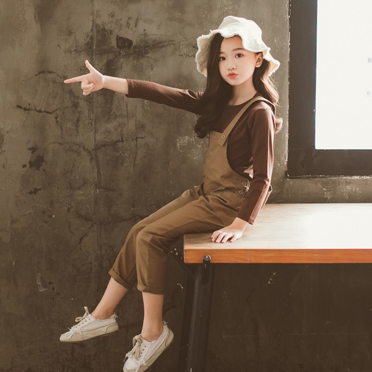 The new autumn girl's suit Korean version boutique big children's brown bib two-piece leisure temperament western style comfortable Style: Korean Applicable season: Spring and Autumn pattern: plain Applicable gender: female Made of: Cotton Thickness: conventional Clothing placket: hedging Color classification: brown Reference height: 110 120 130 140 150 160