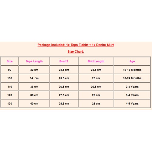 Newest Fashion Baby Girls Outfits !! High quality and Brand new 100% Main Color: AS The Picture New in Fashion Material: Cotton Attention plz: If your kid is chubby, we recomend choosing a larger size, thanks. Please kindly refer to your kids actual height and the size chart before buying/bidding. Thanks. Package included: 1x Tops T-shirt + 1x Skirt Size Chart: Size Tops Length Bust*2 Skirt Length Age 90 32 cm 24.5 cm 23.5 cm 12-18 Months 100 34 cm 25.5 cm 25 cm 18-24 Months 110 36 cm 26.5 cm 26.5 cm 2-3 Years 120 38 cm 27.5 cm 28 cm 3-4 Years 130 40 cm 28.5 cm 29 cm 4-5 Years There is 2-3% difference according to manual measurement. please check the measurement chart carefully before you buy the item. 1 inch = 2.54 cm Please note that slight color difference should be acceptable due to the light and screen.
