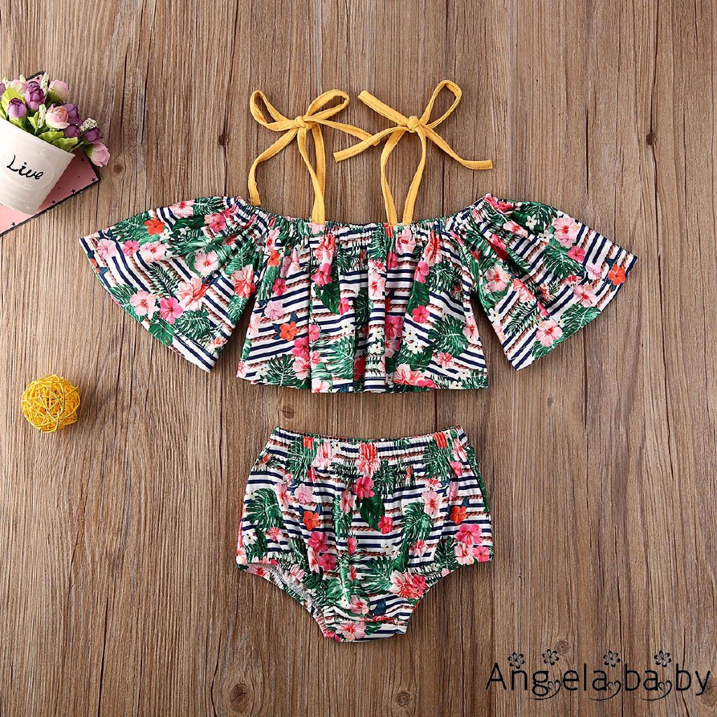 This is A 2-piece Lovely Floral Printed Tankini Swimsuit for Toddler Baby Girls Strapless Off Shoulder High Elastic Crop Tube Top + Bottom Shorts Bathing Suits Beachwear.