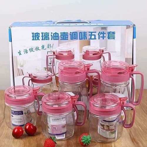 Bộ sản phẩm gồm: 3 hũ gia vị + 2 bình to đựng đồ lỏng (giấm, dầu ăn, xì dầu, nước mắm… )