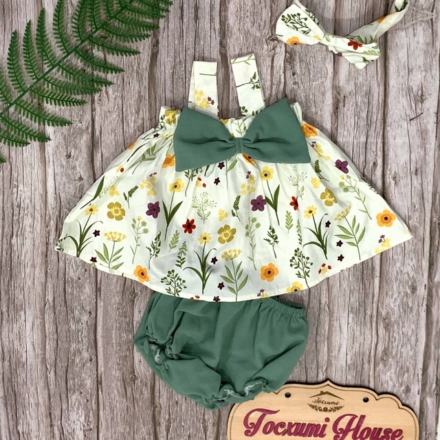 Thời Trang Trẻ Em > Bé gái | 3 tháng-4 tuổi > Váy đầm || SET BỘ ÁO 2 DÂY NƠ XANH (KÈM BĂNG ĐÔ)