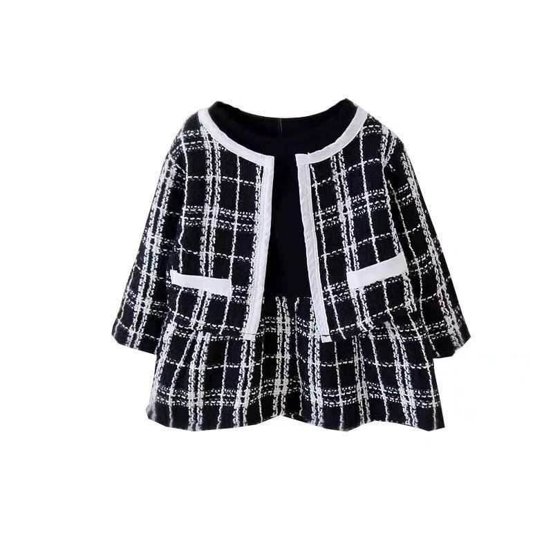 Giới thiệu Set Đồ 2 Món Áo Khoác Cardigan + Đầm Sọc Ca Rô Đen Trắng Thời Trang Xuân Thu Cho Bé Gái