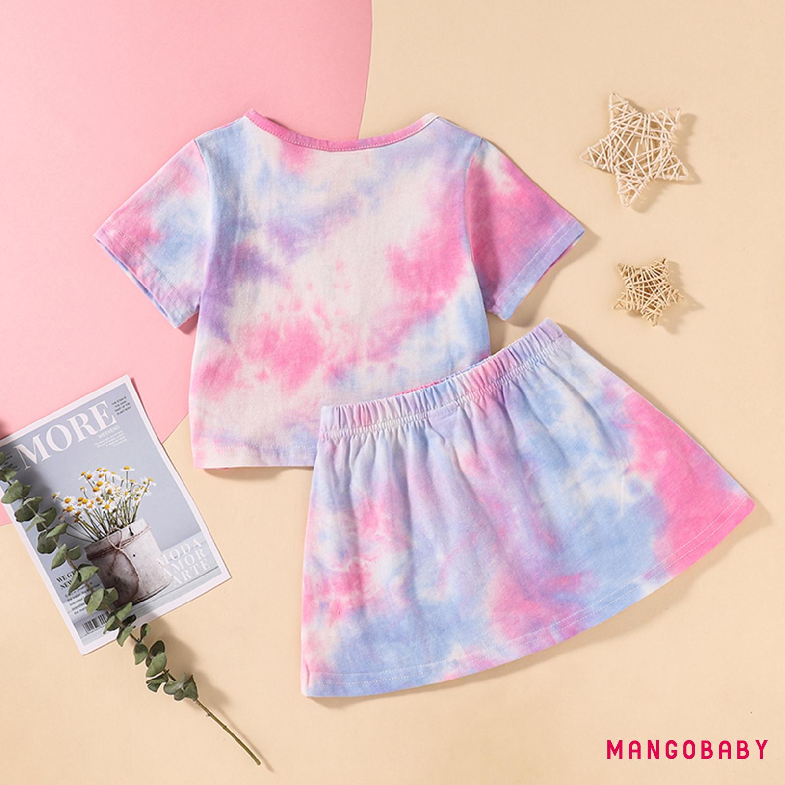 Tie-dyed and letters printed patterson round collar short sleeve tops match with the short skirt, Making you child comfortable and stylish.