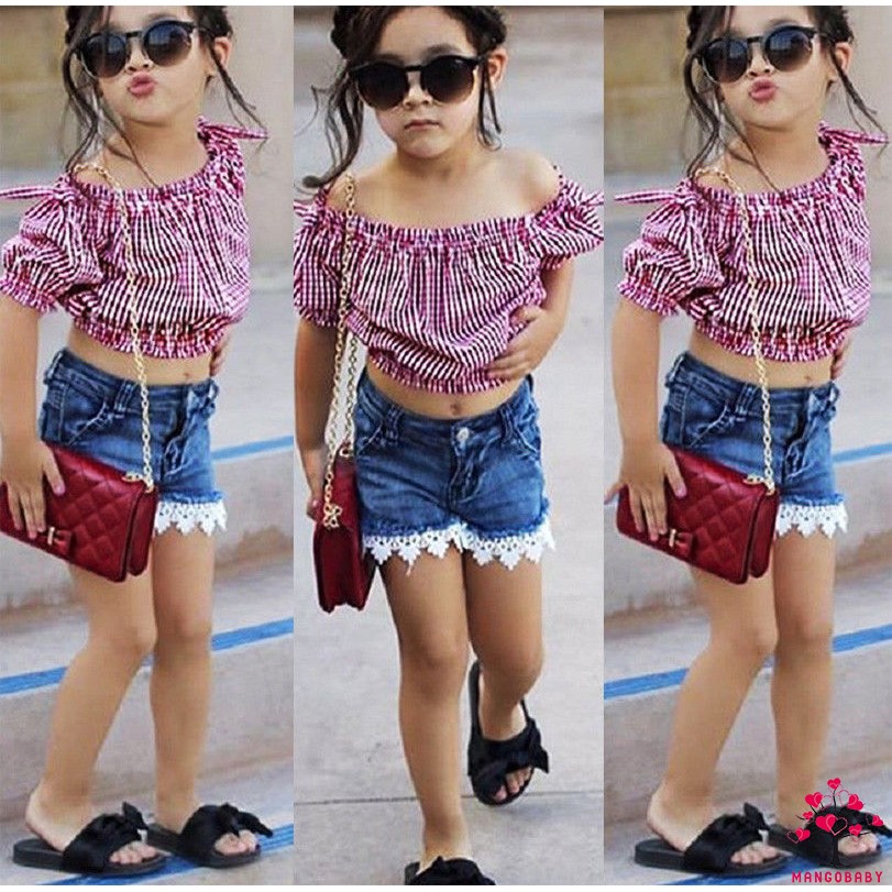 Giới thiệu Set Đồ 2 Món Gồm Áo Trễ Vai Họa Tiết Sọc Caro + Quần Short Denim Cho Bé Gái 0 Tuổi
