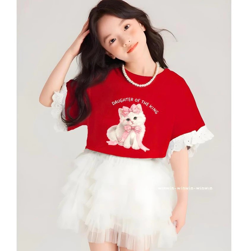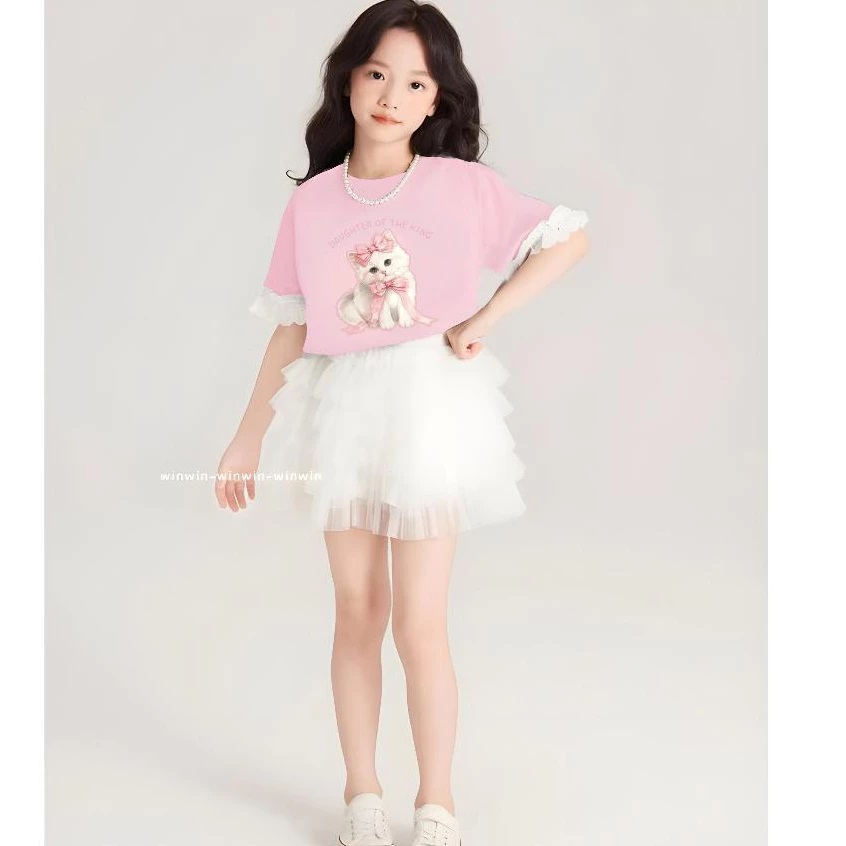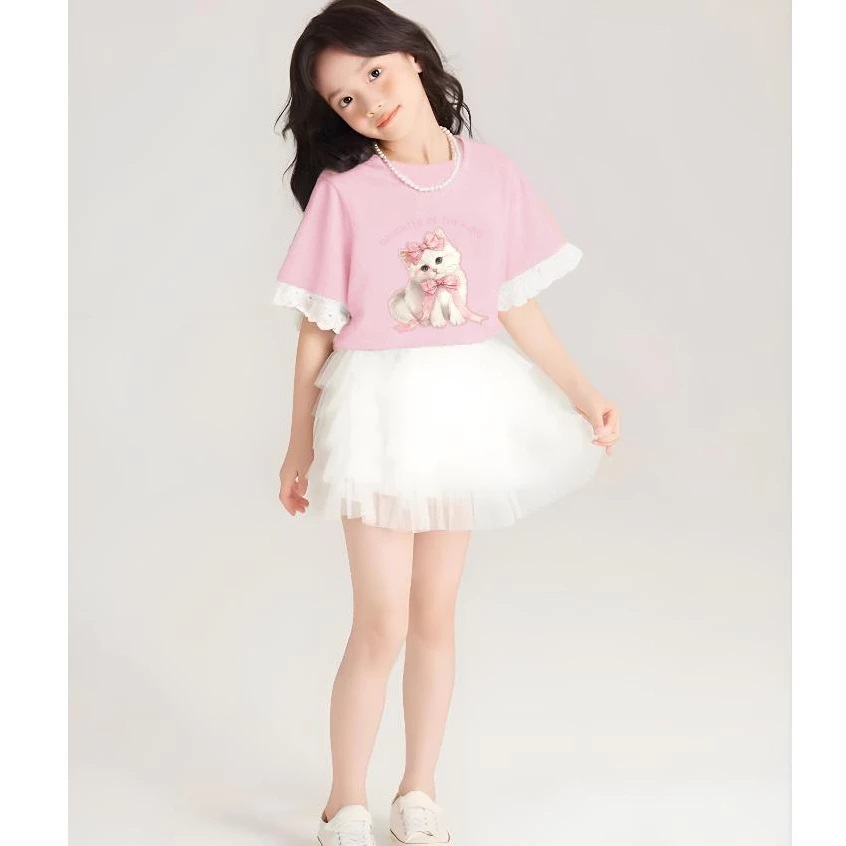 Set Đồ Bé Gái Áo Thun Mèo Phối Ren Tay + Chân Váy Voan Xếp Tầng Siêu Xinh Từ 12-45kg Dành Cho Bé Gái