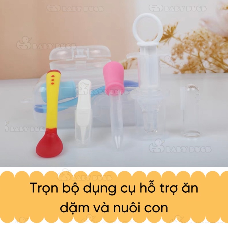 Set hỗ trợ bé ăn dặm, uống thuốc gồm - rơ lưỡi silicon làm sạch - thìa báo nóng - ống bón sữa thuốc - xilanh hỗ trợ uống thuốc. Mua set giá cực tốt luôn hơn mua lẻ Xuất xứ: Trung Quốc, Nhà sản xuất: Hangjia Industry and Trade. Địa chỉ: số 1 Chuangsi, Chiết Giang, Trung Quốc Phân phối bởi: Baby duck, địa chỉ: Xuân Dục, Mỹ Hào, Hưng Yên