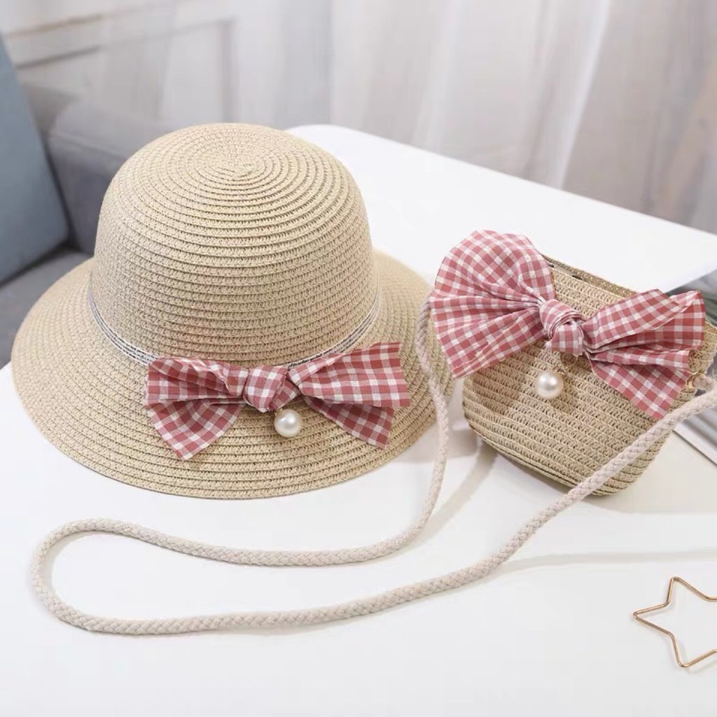 Giới thiệu Set mũ nón cói chống nắng; Túi xách phong cách mùa hè cho bé gái; M15 - BONMIE