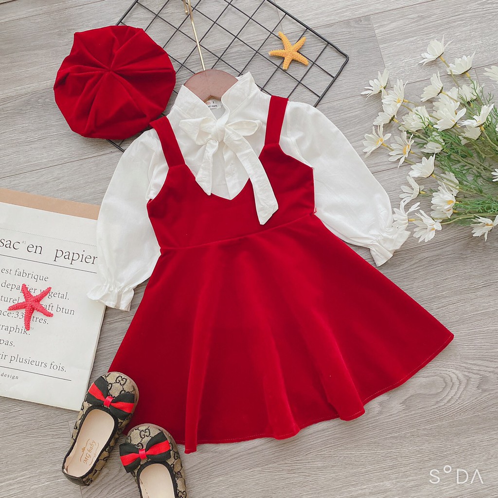Thời Trang Trẻ Em > Bé gái | 3 tháng-4 tuổi > Váy đầm || Set nhung đỏ 3ct kèm mũ cho bé