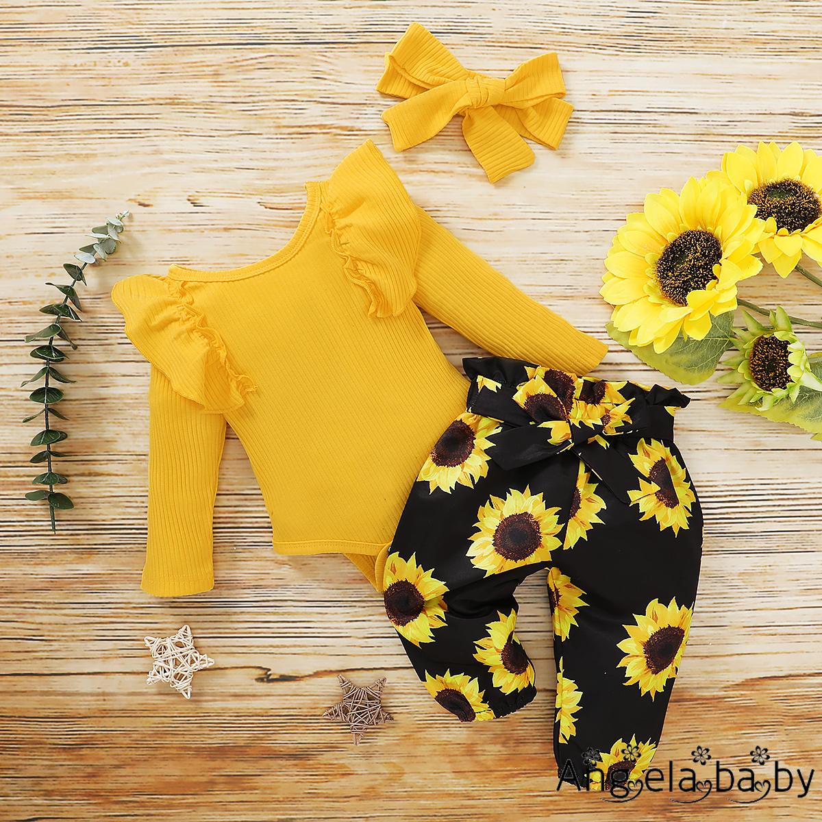 Bộ trang phục ba món màu sắc tươi tắn họa tiết hoa hướng dương cho bé gái 0-24 tháng tuổi