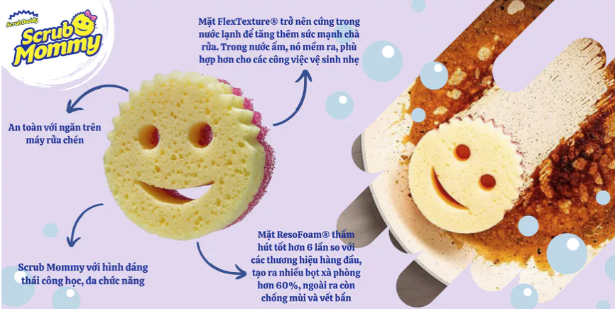 - Hai mặt + Kiểm soát nhiệt độ: Scrub Mommy đưa miếng bọt biển và dụng cụ chà nhà bếp truyền thống lên một tầm cao mới với thiết kế hai mặt của mình. Một mặt, bọt FlexTexture thay đổi dựa trên nhiệt độ nước. Mềm trong nước ấm và cứng trong nước mát. Mặt khác, ResoFoam xốp giúp tạo bọt xà phòng để lau vết đổ.