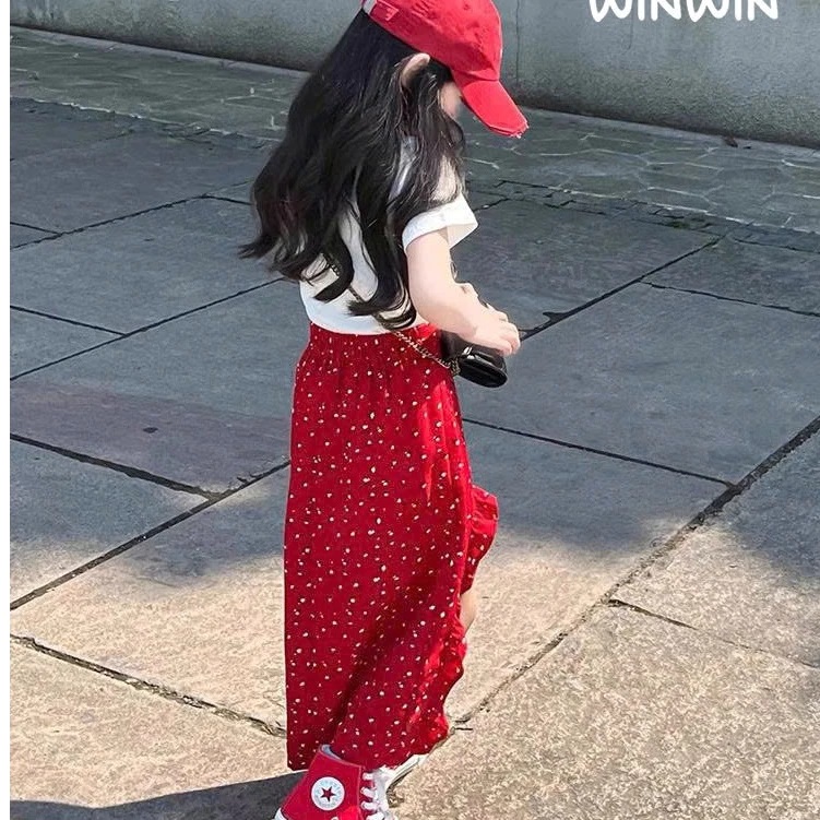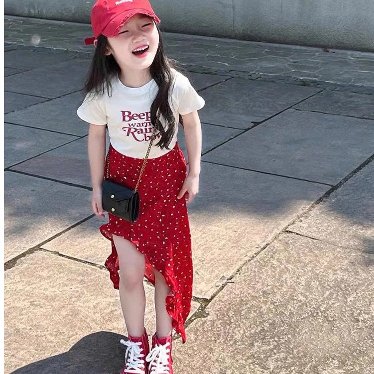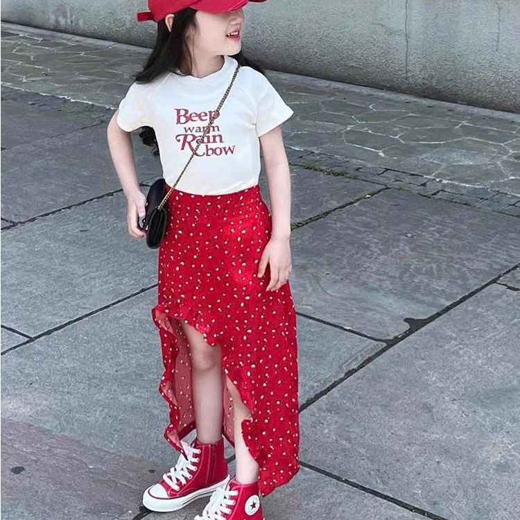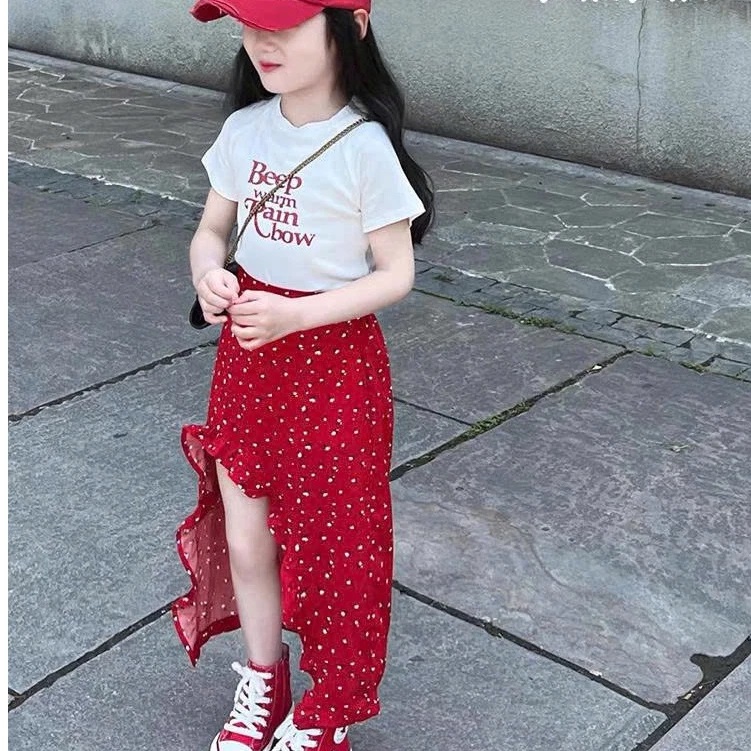 Set Váy Midi Bé Gái Đỏ Nổi Bật – Áo Thun In Chữ Kèm Chân Váy Lụa Bèo Xẻ Tà Nàng Thơ Từ 20-45kg Dành Cho Bé Gái