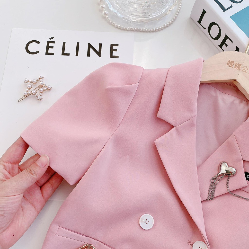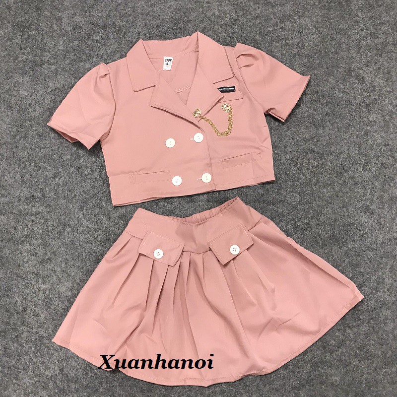 Thời trang trẻ em & trẻ sơ sinh > Quần áo bé gái > Com lê & đồ bộ || Set váy Vest bé gái hồng Áo và Chân váy xếp ly liền quần chip size 15-30kg (áo kèm phụ kiện)XHN689