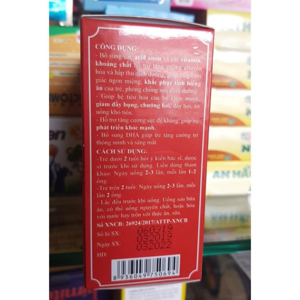 - Bổ sung các acid amin (L-lysine,Taurin), enzyme tiêu hóa và các vitamin, hỗ trợ tăng cường chuyển hóa và hấp thu dưỡng chất, khắc phục tính biếng ăn của trẻ. - Hỗ trợ tiêu hóa thức ăn, giảm đầy bụng, chướng hơi, đầy hơi, ăn uống khó tiêu. 📌📌📌ĐỐI TƯỢNG SỬ DỤNG: - Dùng cho trẻ biếng ăn tiêu hóa kém, không hấp thu được dinh dưỡng, hay rối loạn tiêu hóa. - Trẻ em sức đề kháng kém hay mắc các bệnh về đường hô hấp. - Trẻ em mới ốm dậy, gầy yếu còi xương suy dinh dưỡng, chậm phát triển. - Trẻ dưới 2 tuổi dùng theo hướng dẫn của bác sĩ, dược sĩ 🍒🍒🍒HƯỚNG DẪN SỬ DỤNG: - Trẻ em từ 2-3 tuổi : ngày 1 -3 lần, mỗi lần 2 thìa café 10ml (1 ống ) - Trẻ em từ 3-6 tuổi : ngày 2-3 lần, mỗi lần 2 thìa café 10ml (1 ống ) - Trẻ em trên 7 tuổi và người lớn : ngày 3-4 lần mỗi lần 4 thìa café 20ml (2 ống ) - Trẻ dưới 2 tuổi hỏi ý kiến bác sĩ, dược sĩ. - Liều lượng tham khảo: Ngày uống 1 – 2 lần, mỗi lần 2 thìa café (1 ống). - Lắc đều trước khi uống.