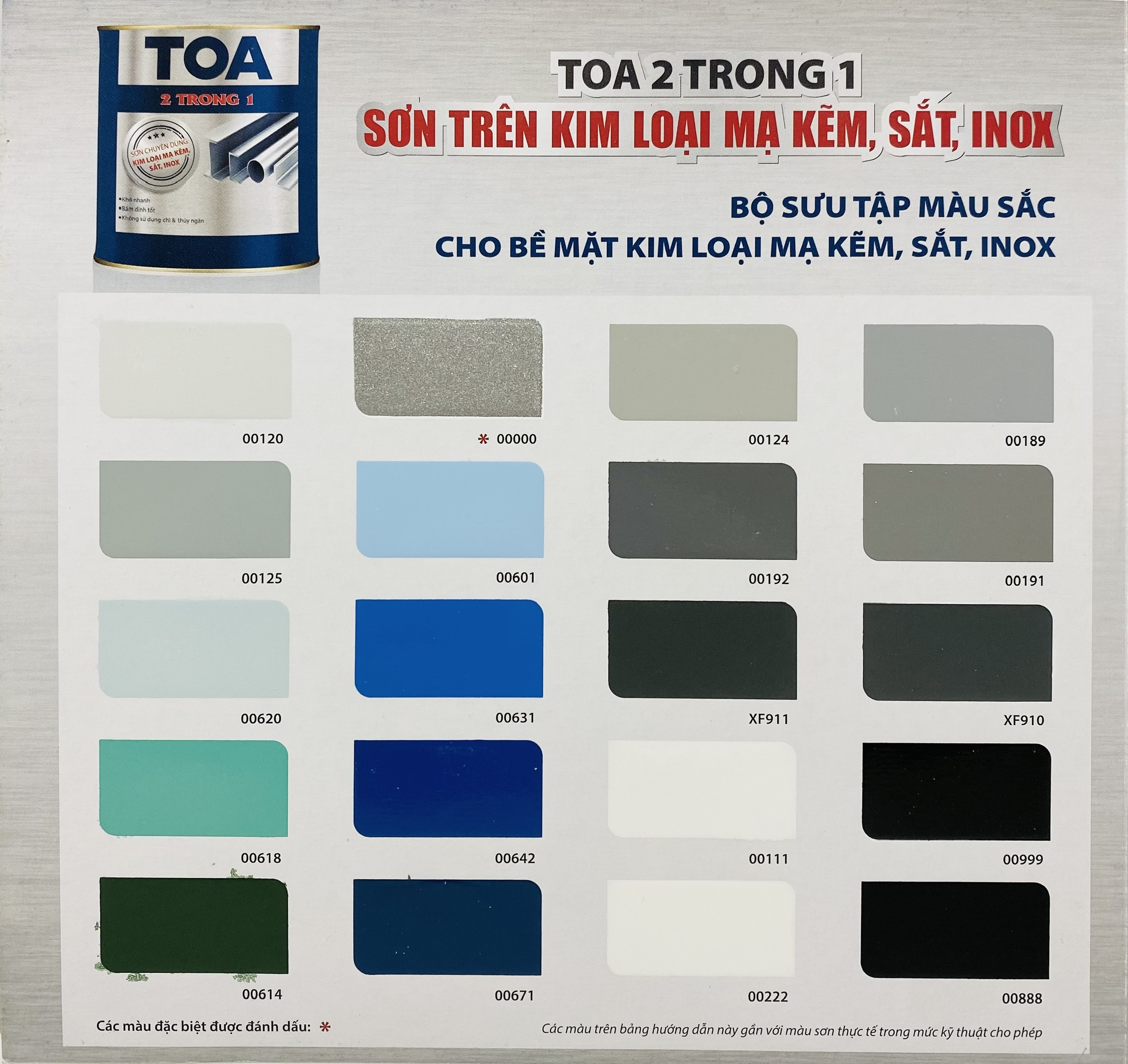 Sơn sắt mạ kẽm TOA 2 trong 1 là dòng sơn có cấu tạo chủ yếu từ nhựa Acrylic một thành phần với sự kết hợp của lớp sơn lót và sơn phủ trong cùng một một sản phẩm. Đây là loại sơn an toàn cho sức khỏe với các đặc tính nổi bật: bám dính tuyệt hảo trên nhiều bề mặt, khô nhanh, màng phim cứng chắc, không sử dụng crom, chì .