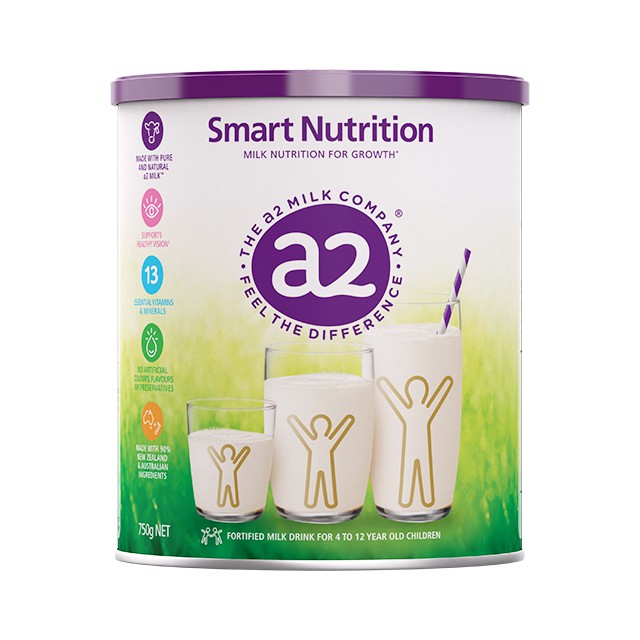 Thức uống bổ sung đặc biệt giàu dinh dưỡng và siêu ngon miệng được làm từ nguồn sữa A2 tinh khiết có chứa A2 Protein thuần chủng. Dành cho bé từ 4-12 tuổi. Sữa A2 Smart Nutrition chứa nguồn vitamin và khoáng chất dồi dào được chọn lọc kĩ lưỡng bởi các chuyên gia dinh dưỡng hàng đầu, và đặc biệt, sản phẩm được sản xuất với nguyên liệu tươi mới tại Úc. Sữa A2 Smart Nutrition tự hào được sử dụng như một thực phẩm bổ sung hoàn hảo trong chế độ dinh dưỡng hàng ngày của trẻ, bên cạnh nhiều loại thực phẩm khác mà không gây ra các hiện tượng như biếng ăn, dư chất. Đây là dòng sản phẩm cao cấp đạt tất cả tiêu chí để giúp trẻ duy trì và phát triển sức khoẻ dinh dưỡng một cách toàn diện nhất. • Làm từ nguồn sữa có chứa A2 protein – sáng chế trí tuệ của tập đoàn a2 Milk • Chống biến đổi genes • Hỗ trợ hệ tiêu hoá tuổi • Chống dậy thì sớm • Chứa 13 loại Vitamins và khoáng chất thiết yếu • Không phẩm màu, không hoá chất phụ gia, chất bảo quản • Nguyên liệu sản xuất từ Úc và NewZealand