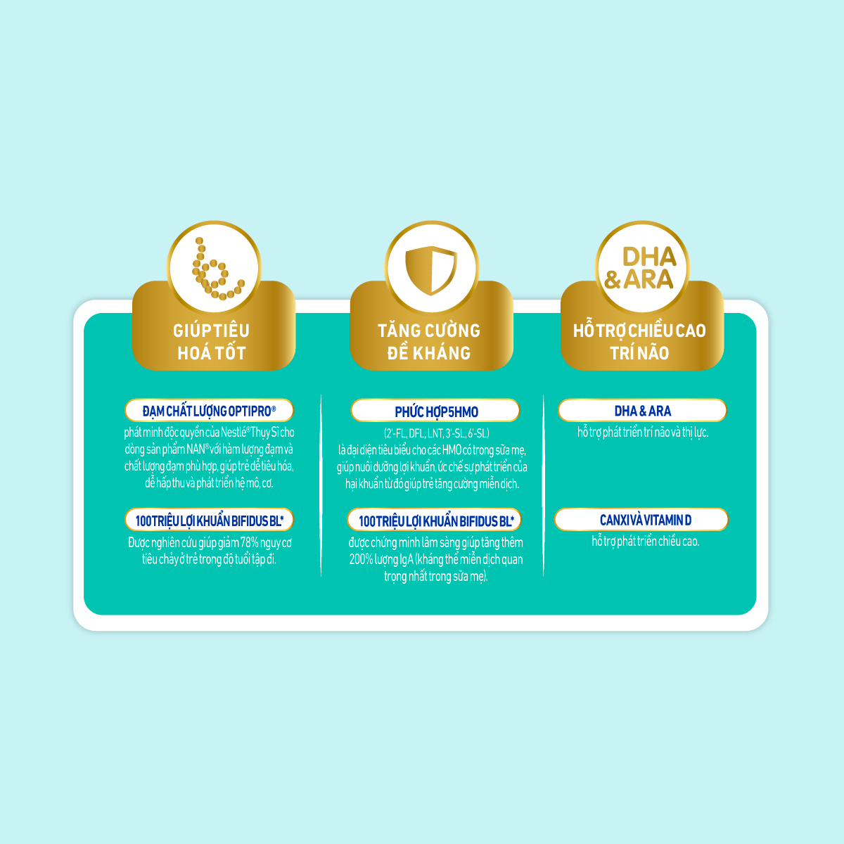 - Đạm chất lượng Optipro: phát minh độc quyền của Nestlé Thụy Sĩ cho dòng sản phẩm NAN với hàm lượng đạm và chất lượng đạm phù hợp, giúp trẻ dễ tiêu hóa, dễ hấp thu và phát triển hệ mô, cơ.