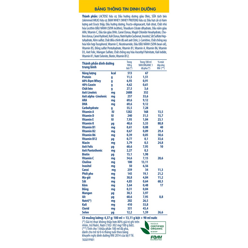 Mô tả sản phẩm Sản phẩm dinh dưỡng công thức Nestlé NAN Organic 1 900G là sản phẩm dinh dưỡng công thức hữu cơ dành cho trẻ từ 0 đến 6 tháng. Nestlé NAN Organic 1 với các thành phần* đáp ứng tiêu chuẩn hữu cơ khắt khe của NASAA, cơ quan chứng nhận hữu cơ của Úc. Những thành phần có nguồn gốc từ những trang trại mà những con bò được tiếp cận với không khí trong lành và ăn các thức ăn hữu cơ. Nestlé NAN Organic 1 cung cấp cho trẻ các chất dinh dưỡng hỗ trợ cho sự phát triển khỏe mạnh về thể chất và trí não (*) sữa tách béo, lactose, đạm whey Cách pha chế: 1. Rửa sạch tay trước khi pha Nestlé® NAN® ORGANIC 1 cho trẻ. 2. Rửa cốc và nắp đậy cho đến khi không còn bợn bẩn. 3. Đun sôi cốc và nắp đậy trong 5 phút. Đậy nắp kín cho đến khi sử dụng 4. Đun sôi nước trong 5 phút, để nguội bớt. 5. Tham khảo bảng hướng dẫn cách pha, rót chính xác lượng nước ấm cần dùng vào cốc đã được luộc. 6. Chỉ dùng muỗng lường trong hộp và gạt ngang muỗng lường vào mép/ gờ của thành hộp. 7. Tham khảo bảng hướng dẫn cách pha, thêm chính xác số lượng muỗng lường (gạt ngang) tương ứng với độ tuổi của trẻ. 8. Sau khi dùng, đặt muỗng lường trên giá treo bên trong hộp. 9. Đậy nắp và lắc hoặc khuấy cho đều đến khi bột được hòa tan hoàn toàn và cho trẻ uống liền. Không giữ lại phần thừa nếu trẻ không uống hết. 10. Cách bảo quản: đậy kín nắp hộ sau mỗi lần sử dụng và bảo quản nơi khô ráo. Nên sử dụng trong vòng 3 tuần sau khi mở hộp