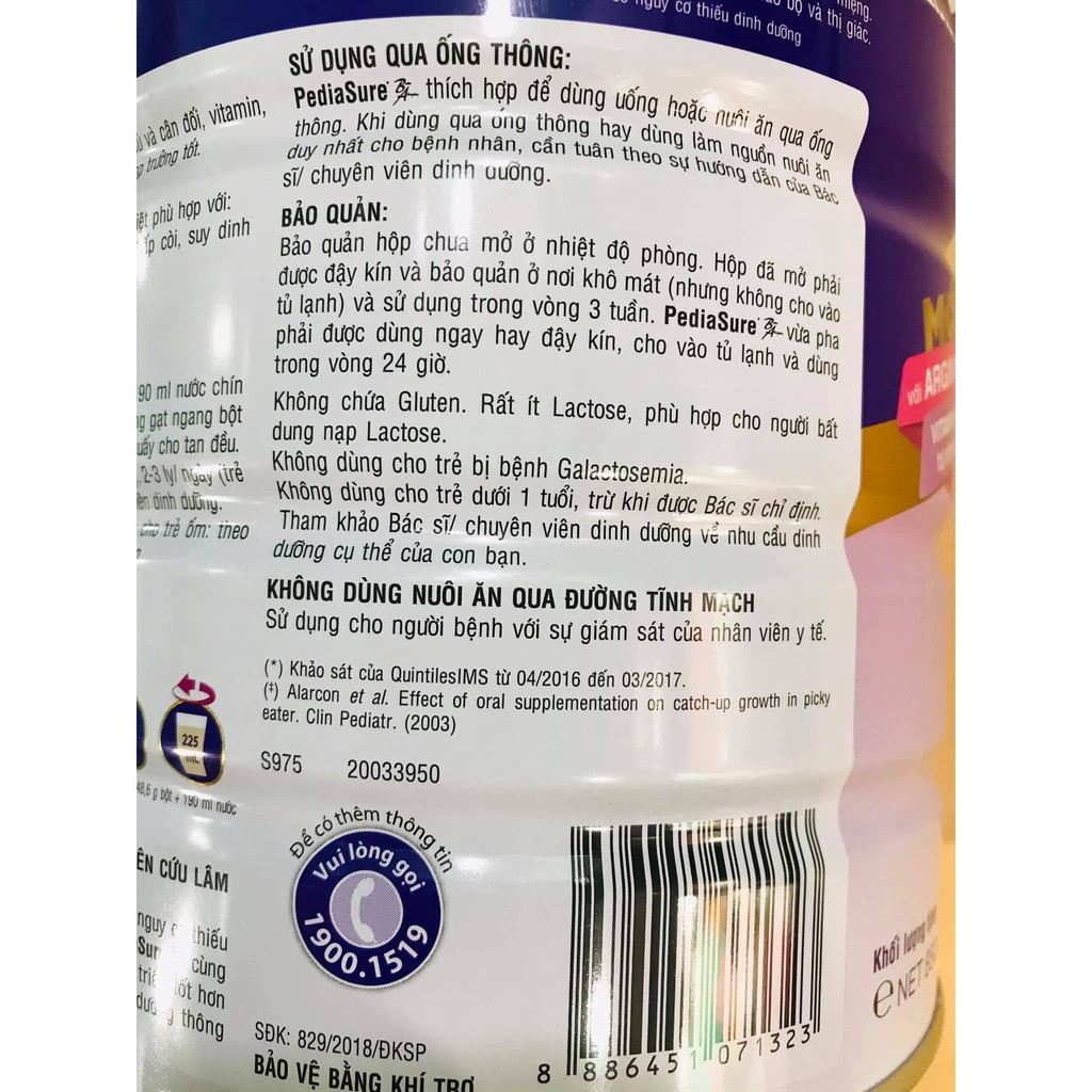 Với nguồn dinh dưỡng đầy đủ và cân bằng với 37 dưỡng chất thiết yếu Giúp bé tăng trưởng rõ rệt chỉ sau 9 tuần Tăng chiều cao, cân nặng và sức đề kháng - Sữa bột Pediasure (850g) có chứa 3 nguồn đạm, canxi và Vitamin D giúp cân bằng và duy trì liên tục axit amin thiết yếu để phát triển cơ và xương. - Arginin gia tăng số lượng và hoàn thiện các tế bào ở đĩa sụn giúp xương phát triển. - Vitamin K2 tự nhiên giúp tăng cường vận chuyển canxi giúp tăng khối lượng và cho xương chắc khỏe. - Prebiotic, probiotic và selenium và kẽm giúp hấp thụ và tăng cường sức đề kháng tốt hơn. - Đối tượng sử dụng: trẻ biếng ăn từ 1-10 tuổi. * * * Cách pha 1 ly PediaSure chuẩn: Cho 190ml nước chín nguội vào ly, vừa từ từ cho vào 5 muỗng gạt ngang vừa khuấy đều cho đến khi bột tan hết. * * * Bảo quản: Bảo quản hộp chưa mở ở nhiệt độ phòng. Hộp đã mở phải được đậy kín và bảo quản ở nơi khô mát (nhưng không cho vào tủ lạnh) và sử dụng trong vòng 3 tuần. PediaSure vừa pha phải được dùng ngay hay đậy kín, cho vào tủ lạnh và dùng trong vòng 24 giờ. * * * Lưu ý: Không dùng cho trẻ bị bệnh Galactosemia. Không dùng cho trẻ dưới 1 tuổi, trừ khi được bác sĩ chỉ định. Tham khảo bác sĩ/chuyên viên dinh dưỡng về nhu cầu dinh dưỡng cụ thể của con bạn. Không dùng nuôi ăn qua đường tĩnh mạch. Sản phẩm không phải là thuốc và không có tác dụng thay thế thuốc chữa bệnhA.