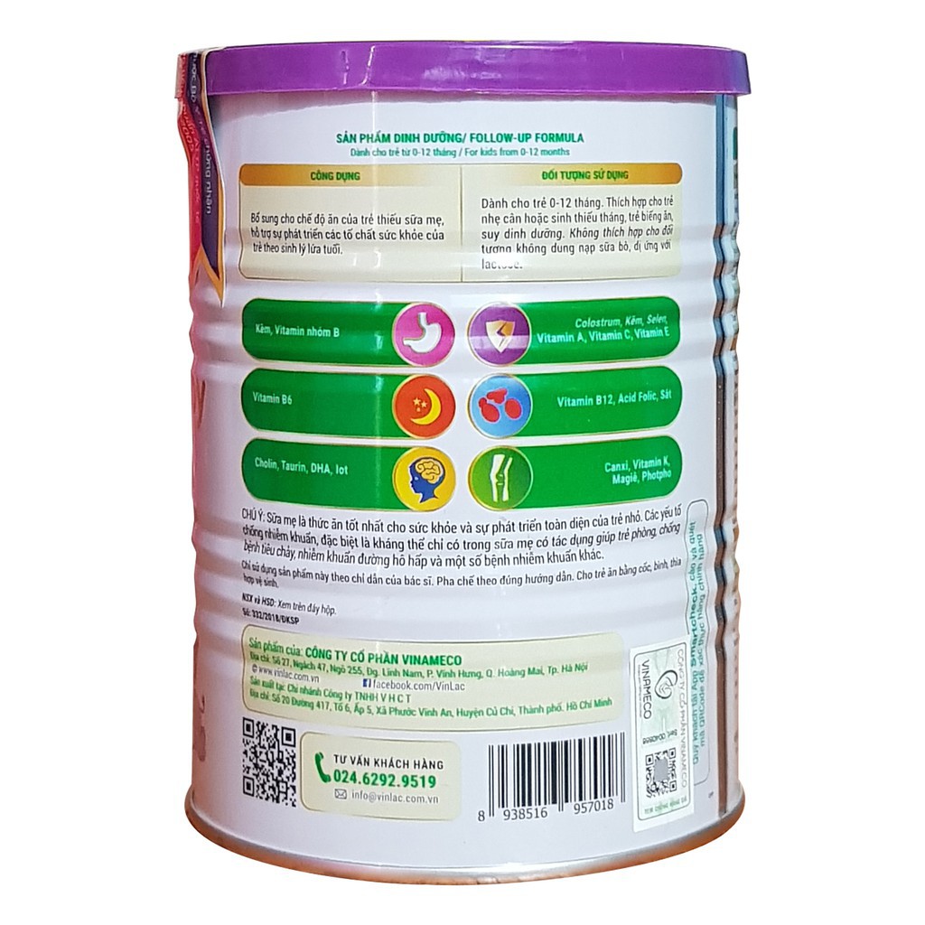 VINLAC BABY dành cho các bé sơ sinh từ 0 – 12 tháng. Được tối ưu dinh dưỡng giúp bé tăng sức đề kháng, khỏe mạnh, phát triển toàn diện, nên sữa đặc biệt phù hợp với trẻ sinh thiếu tháng, mẹ thiếu hoặc không có sữa. 1.Thành phần của sữa chứa Protein sữa – một dưỡng chất quan trọng giúp củng cố và xây dựng lượng cơ, hỗ trợ tăng trưởng chiều cao, cân nặng một cách tốt nhất. Vinlac Baby còn chứa sữa non Colostrum – một kháng thể tự nhiên thường có nhiều trong sữa mẹ, giúp bé nâng cao sức đề kháng, hạn chế ốm bệnh. Không chỉ hỗ trợ tăng cân, tăng sức đề kháng trong Vinlac Baby cũng chứa đầy đủ các dưỡng chất khác như các loại Vintamin, các axit amin, các vi chất cần thiết khác cần cho sự phát triển của bé như Kẽm, Lysin, Sắt, Canxi, Magie, Iot, DHA, Cholin, Taurin,… giúp bé hấp thu dưỡng chất tối đa. - Chất xơ Prebiotic và vitamin A có trong sữa, giúp hỗ trợ hệ tiêu hoá của bé tốt hơn. Gồm các thành phần Choline và DHA giúp phát triển chức năng não bộ của bé, tăng cường trí nhớ, hoàn thiện khả năng nhìn của mắt đồng thời ngăn ngừa các bệnh liên quan đến tim mạch. - Bên cạnh chức năng mà Vinlac baby mang lại, sản phẩm có mùi thơm dễ chịu, không béo ngậy các bé dễ dàng uống hơn. Vậy nên, với các bé chậm lớn, thấp còi thì Vinlac baby chính là giải pháp tối ưu giúp bé phát triển toàn diện cả về trí não và thể chất 2.Thành Phần Sữa bột nguyên kem(43%), sữa bột tách béo(20%), đường lactose, maltodextrin, protein sữa, sữa non colostrum, dầu cá ( Acid docosahexaenoic ( DHA), Acid linoleic, Acid alphalinolenic ( ALA)), hỗn hợp các khoáng chất (Calci carbonat, magnesi chlorid, sắt (II) sulphat, natri carbonate, đồng sulphat, magan sulphat, kali iodid), hỗn hợp các vitamin ( Retiol ( vitamin A), Cholecalciferol ( vitamin D3), alpha Tocopherol ( vitamin E), Phytomenadion ( Vitamin K), Acid ascorbic ( vitamin C), Thiamin hydroclorid ( vitamin B1), Riboflavin ( vitamin B2), Nicotiamid ( vitamin B3), Pyridoxin Hydro clorid ( vitamin B6), Cyannocobalamin ( vitamin B12), Acid pteroymonoglutamic ( vitamin B9), D- Pantothenate,calci ( vitamin B5), D- Biotin), Choline Chloride, Taurine, Inositol, L- Carnitine, hương vani tổng hợp. Thành phần có chứa sữa. 3. Hướng dẫn sử dụng Sữa Vinlac Baby 900g: + Chuẩn bị: Rửa sạch tay và dụng cụ pha bằng xà phòng và nước. Đun sôi các dụng cụ pha trong vòng 5 phút. Đun sôi nước, để nguội 45 ° – 50 ° C. + Pha theo bảng tỷ lệ theo độ tuổi có ghi trên nhãn lon sữa + Cách dùng: Mỗi lần pha chỉ nên pha đủ cho một lần dùng và dùng hết trong vòng 1 giờ. Nếu dùng không hết thì bỏ phần còn thừa. Nếu sản phẩm pha xong chưa dùng ngay thì phải bảo quản trong tủ lạnh ở 2° -4°C và chỉ dùng trong 24 giờ. Sản phẩm của công ty cổ phần Vinameco HSD: 02 năm kể từ ngày sản xuất phát triển toàn diện cả về thể chất và trí tuệ.