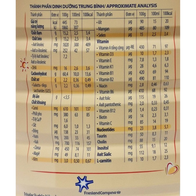 Giai đoạn từ 1 đến 2 tuổi, mỗi ngày bé đều háo hức tìm hiểu những điều mới lạ thông qua trí tò mò và các hoạt động vui chơi cùng gia đình, người thân. Ở giai đoạn này, cùng với sự hỗ trợ từ mẹ - như một người bạn - và việc xây dựng chế độ dinh dưỡng phù hợp sẽ giúp bé phát triển khỏe mạnh, đặc biệt là về tư duy và trí tuệ để khám phá thế giới mỗi ngày. Đến từ thương hiệu Friso - thương hiệu có 140 năm kinh nghiệm trong ngành công nghiệp sữa, sữa Frisolac Gold số 3 900g dưới đây sẽ là sản phẩm hỗ trợ mẹ xây dựng hệ dinh dưỡng cân bằng, cung cấp nguồn năng lượng mỗi ngày cho bé. Frisolac Gold 3 được thiết kế đặc biệt để đáp ứng nhu cầu dinh dưỡng của trẻ đang trong giai đoạn phát triển từ 1-2 tuổi sẽ giúp bé phát triển toàn diện cả về chiều cao, cân nặng lẫn trí tuệ và các giác quan. Cung cấp các dưỡng chất quan trọng - Frisolac Gold 3 cung cấp nguồn năng lượng dồi dào cho bé nhờ lượng đạm, chất béo, carbonhydate và các vitamin cân đối, xây dựng hệ dinh dưỡng cân bằng giúp bé luôn khỏe mạnh để thực hiện các hoạt động vui chơi khám phá mỗi ngày. - Frisolac Gold 3 bổ sung hàm lượng vitamin D và canxi cao giúp hệ xương và răng được hình thành khỏe mạnh, hỗ trợ bé phát triển tốt chiều cao trong giai đoạn này. - Sự kết hợp tối ưu giữa hệ dưỡng chất Synbiotics (Probiotics và Prebiotics theo tỷ lệ 9/1) cùng các dưỡng chất khác như kẽm, nucleotides, selen giúp hỗ trợ hệ miễn dịch và bảo vệ bé từ bên trong, từ đó phòng ngừa các chứng bệnh thông thường để bé có thể tự do trải nghiệm và khám phá thế giới: + Hệ dưỡng chất Synbiotics: (GOS & FOS ): tăng cường hệ vi khuẩn có ích trong đường ruột, giúp hệ tiêu hóa hoạt động tốt và hỗ trợ hệ miễn dịch. + Kẽm, sắt: có khả năng chống oxy hóa, rất quan trọng cho hệ miễn dịch. + Selen: hỗ trợ các chức năng của hệ miễn dịch. + Nucleotides: tạo các tế bào kháng khuẩn, giúp hệ miễn dịch khỏe mạnh hơn. - Frisolac Gold 3 cung cấp DHA kết hợp cùng các dưỡng chất khác góp phần quan trọng trong việc phát triển trí não, hỗ trợ tối đa các hoạt động vui chơi khám phá của bé từ 1 - 2 tuổi: + DHA: rất cần thiết cho phát triển hoàn thiện chức năng nhìn của mắt, sự phát triển hoàn hảo hệ thần kinh. DHA có tác dụng giảm cholesterol toàn phần và triglyceride máu, LDL-cholesterol (cholesterol xấu), giúp dự phòng các bệnh tim mạch. + Choline là dưỡng chất quan trọng hỗ trợ phát triển não, giúp tổng hợp acetylcholine và chất dẫn truyển thần kinh quan trọng liên quan đến trí nhớ và khả năng học hỏi sau này. + DHA và AA giúp phát triển cấu trúc của não bộ và võng mạc. SA hỗ trợ tăng trưởng tế bào thần kinh.