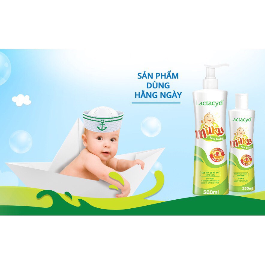 Dành tắm cho bé từ sơ sinh, tắm lactacy giúp bé chống rôm sảy. Thành phần sữa tắm gội cho bé Lactacyd Milky 250ml - Thành phần: Lactoserum atomisat 0.93 g, acid lactic 1 g.Water, Cocamidopropyl Betaine, PEG-80 Sorbitan Laurate, Sodium Laureth Sulfate, PEG-150 Distearate, Tetrasodium EDTA, Sodium Chloride, Polyquaternium-10, Fragrance, Quaternium-15, Citric Acid, Sodium Hydroxide. - Ngoài ra, acid lactic và lactoserum là 2 thành phần tự nhiên sẽ giúp giảm thiểu các kích ứng cho da bé. Sản phẩm tuân thủ các tiêu chuẩn nghiêm ngặt của một dược phẩm chăm sóc da cho trẻ sơ sinh và trẻ nhỏ. - Xuất xứ: Hàng liên doanh Pháp - Việt, sản xuất bởi tập đoàn Sanofi Aventis - Dung tích: 250ml - Dùng cho bé từ sơ sinh trở lên - Nhà sản xuất: Công ty sanoti Việt Nam - Cách sử dụng: Lắc kỹ sữa tắm trước khi sử dụng.Trẻ sơ sinh, trẻ nhỏ pha loãng 1 - 1.5 nắp chai trong chậu nước tắm, tắm lại bằng nước sạch.
