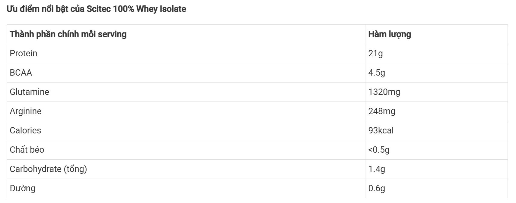 Scitec 100% Whey Isolate là lựa chọn lý tưởng cho những ai cần sản phẩm tăng cơ chất lượng cao, dễ hấp thụ và không gây đầy bụng. Nếu bạn đang cutting, lean bulk hoặc tìm một loại whey sạch, ít tạp chất, thì đây chính là sự đầu tư đúng đắn cho mục tiêu thể hình lâu dài.