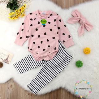 ღWSVღLove Heart Pink Baby Girls Long Sleeve Romper Bodysuit +Stripe Pant+ Headaband Casual Cotton Outfits Clothes