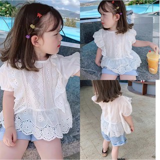 Áo Kiểu Tay Ngắn Phối Ren Hoa Cho Bé Gái