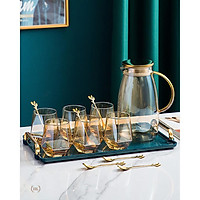 Bộ bình đựng nước thủy tinh kèm 6 cốc màu khay sứ, giá úp cốc kim loại mạ vàng sang trọng