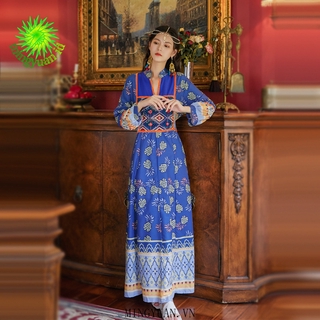 ( Mingyuan ) New retro ethnic heavy industry embroidery printing slim dress
