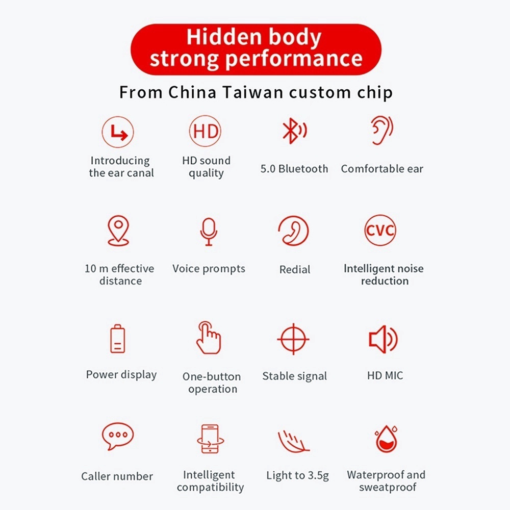 Description: Color: black, white Material: ABS color: black / white Material: ABS Performance: TWS Bluetooth Headset Applicable models: Suitable for all mobile phones and smart devices with Bluetooth function Bluetooth version: dual mode wireless 5.0+EDR, ultra low power consumption Headphones program: Jerry 6939 Protocol mode: A2DP, AVRCP, HSP, HFP Headphone channel: true stereo Control method: touch Prompt tone: English Wireless use frequency band: 2.4Ghz Effective distance: 10m or more Microphone: with Binocular pairing mode: automatic pairing after booting Horn diameter: 8mm Impedance: 32Ω Sensitivity: 42db Distortion: ±5% Battery capacity: Headphones 55mAH Charging bin: 450mAH Headphones music time: 3-4 hours Headphone talk time: 4-5 hours Waterproof rating: IPX4 waterproof Battery compartment charging interface: micro USB Charging time: 1 hour Charging box charging voltage: 5v Touch function: the caller touches for 1 second to answer, long touch hangs up the phone, continuously taps the 2nd end number to make a call, music switches, long touch 2 seconds to switch the next song. Long press for 3 seconds to summon siri. Single ear weight: 5g Net weight: 41g Gross weight: 71g Charging bin size: 10CM*4Cm*3Cm Packing size: 13cm*9*3.5cm Packing: color box