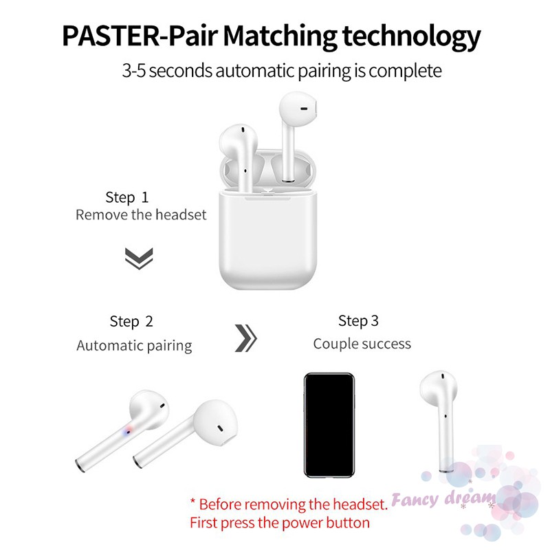 -------------------- Welcome to Fancydream ------------------------- Almost items are available. Chinese seller,ship from oversea. Ready stock will be ship out within 1-3 days,the logistic need "5-10 days" ,hope you note before you order, thanks! You can leave the message first ,our working time is Monday to Saturday 9:00am-18:00pm,we will reply you as soon as possible. Decription: Feature: 1. Listen to the correct song, record songs and phone calls 2. Remember the call number, the last call, all the Chinese and English smart voice messages, boot, pair, turn off the phone power will send a low voice message 3. The power capacity will be displayed on your phone. The numbers can only be used as a reference. It is not accurate 4. After the Bluetooth headset is turned off, connect to the mobile phone, connect the Bluetooth headset and then automatically turn on the mobile phone, which is more convenient; 5. Smart compatibility: compatible with all mobile phones, including Bluetooth, tablets, notebooks, universal mobile phones Specification: Response frequency (Hz): 20-20000 Call time: 2~3 hours Headphone capacity: 35mAh Charging case capacity: 300mAh Headphone charging time: 1 hour Play time: 2~3 hours Charging interface: Compatible for Apple interface Included: 1 Pair x Earphones 1 x Charging Case 1 x Packing box 1 x Instruction manual 1 x Charging cable