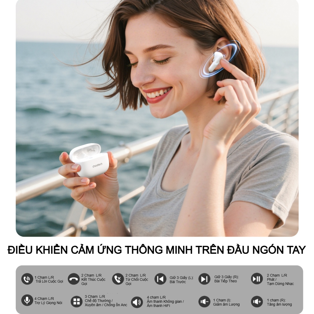 - Điểm nổi bật của tai nghe bluetooth Choetech BH-T55 nằm ở khả năng chống ồn kép với công nghệ ANC chủ động giúp loại bỏ tiếng ồn môi trường xung quanh khi nghe nhạc, kết hợp cùng ENC giúp khử nhiễu hiệu quả trong các cuộc gọi. Nhờ đó, người dùng có thể tận hưởng không gian âm thanh riêng tư hơn và đàm thoại rõ ràng ngay cả trong môi trường ồn ào như văn phòng, quán cà phê hay ngoài đường phố.