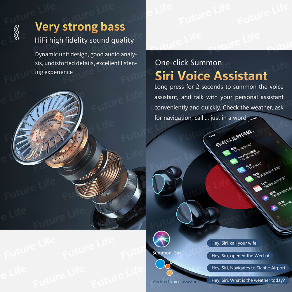 Feature: ⭐1. HD LED power display ⭐2. The powerful performance of Bluetooth 5.0 chip, ultra-low power consumption, improved transmission distance, more stable signal ⭐3. Adopting CVC8.0 and DSP dual noise reduction technology to realize high-definition calls in both ears ⭐4. V5.1 upgrade chip, no game delay ⭐5. AI smart 3D touch, the headset has a built-in high-sensitivity touch panel, and you can intelligently recognize your ideas with a light touch ⭐6. Automatic matching after booting ⭐7. Upgrade magnetic induction ⭐8. HIFI high-fidelity sound ⭐9. Summon SIRI voice assistant with one key ⭐10. Single and dual ears can be switched freely, dual earphones can be used as a mobile phone at the same time, or as a single earphone to connect two mobile phones ⭐11. IPX7 waterproof and sweat proof ⭐12. Can be used as a power bank to charge mobile phones ⭐13. Large capacity charging compartment ⭐14. Fully compatible with Android, IOS, Windows systems