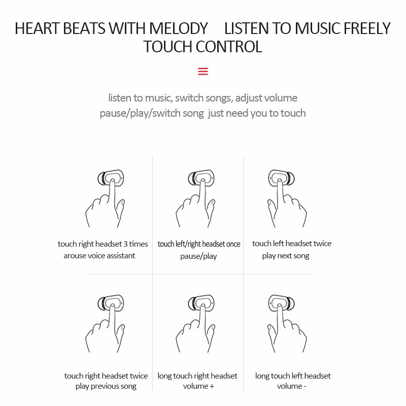 Chip solution: Zhongke Lanyu double call Bluetooth version: V5.0 double call Color: black, white Headphone battery capacity: 50 mA with battery protection board Charging compartment battery capacity: 300 mA with battery protection board Speaker: 32 ohm speakers Charging time: 48 minutes Use time: 5 hours Standby time: 300 hours Charging bin weight: 27g Headphone weight: 3.7g Bluetooth compatible: IOS Android ect Take out the headset in the charging compartment and turn it on automatically. Put back the headset in the charging compartment to automatically shut down. Package contents: Headphones*2 Charging bin*1 Charging cable*1 Manual*1