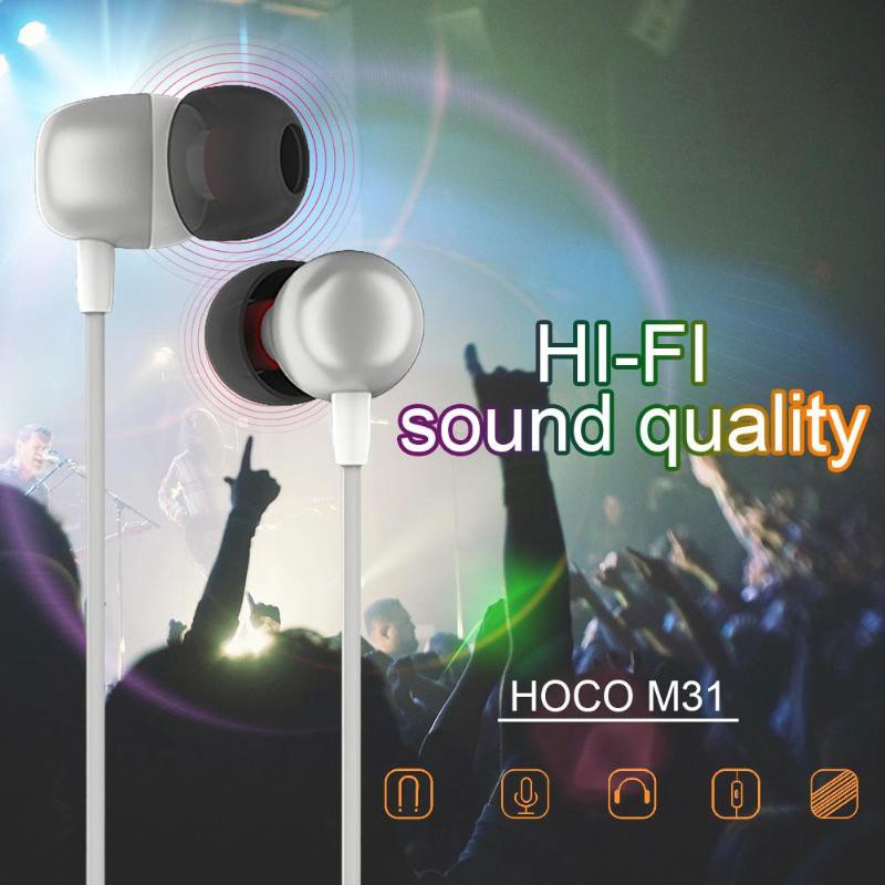 Brand : HOCO Model : M31 1. Material: ABS + aluminum alloy. TPE wire; 2. Length: 1.2 meters; weight: 16 grams; 3. Horn: 10 mm; 4. Connector: 3.5 mm; 5. Microphone: with wheat controller; 6. Wire control: single button control