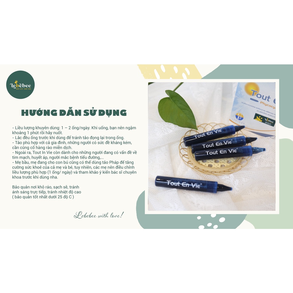 4. Hướng dẫn sử dụng - Uống 1 - 2 ống tảo Tout En Vie mỗi ngày. Nên sử dụng 3 hộp liên tiếp để đạt hiệu quả tốt nhất. - Lắc đều trước khi uống. - Nếu đang sử dụng bất kỳ sản phẩm nào, nên tham khảo ý kiến bác sĩ, chuyên gia trước khi sử dụng. - Bảo quản sản phẩm nơi khô ráo, thoáng mát, tránh ánh nắng trực tiếp. --- [LEBEBEE: HÀNG CHÍNH HÃNG | BẢO HÀNH TRỌN ĐỜI MỌI SẢN PHẨM- PHÁT HIỆN HÀNG GIẢ BỒI THƯỜNG 100 LẦN ]