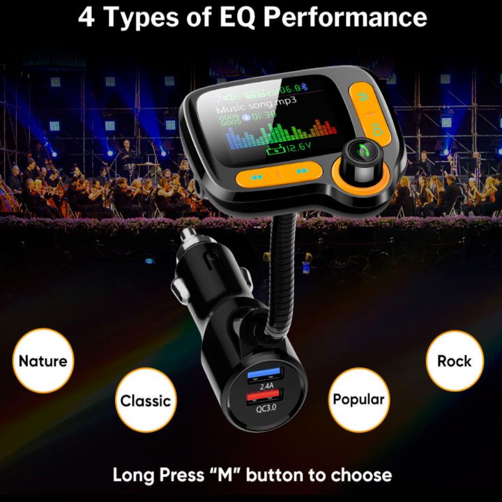 Thông số kỹ thuật sản phẩm 👉 Nguồn điện: Nguồn tẩu trên xe ô tô 👉 Tích hợp 2 cổng USB: USB-1 Quick charger QC3.0, 5V/3A(Max)、9V/2A、12V/1.5A + USB-2, 5V/2.4A 👉 Hỗ trợ thẻ nhớ: Micro SD, 64GB trở xuống 👉 Usb hỗ trợ: USB định dạng FAT32 👉 Nguồn điện: DC12-24V 👉 Hỗ trợ các loại tập tin: MP3/WMA/APE/FLAC/WAV 👉 Điện áp cơ bản: 50-100mA DC12V 👉 Chất lượng âm thanh: 64-320kbps 👉 FM tần số: . 87.5-108MHz 👉 SNR: 85dB (FM: 65db) 👉 Nhiệt độ làm việc: 0℃ – 60℃ 👉 Bluetooth phạm vi <5 m 👉 Kích thước sản phẩm: 70*62*205mm 👉 Trọng lượng: 91.5g
