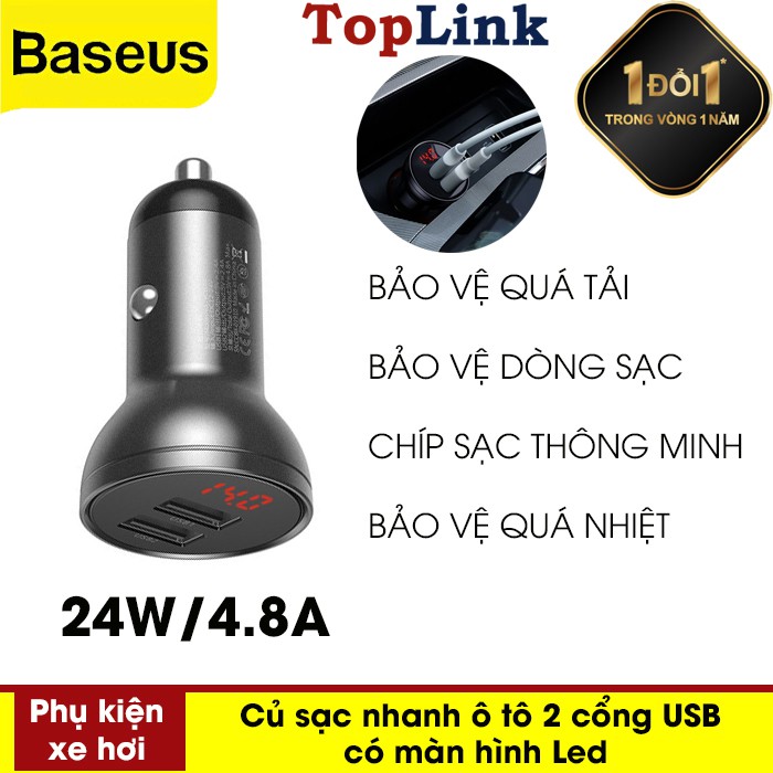 Giới thiệu Tẩu Sạc Điện Thoại Mini Baseus Trên Xe Hơi, Củ Sạc Nhanh Ô Tô 2 Cổng USB 24W / 4.8A - TopLink