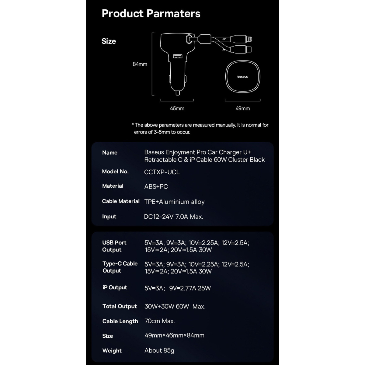 Giới thiệu Tẩu sạc dùng trên ô tô tích hợp cáp Type C và iP Cable 60W Baseus Enjoyment Pro Car Charger.