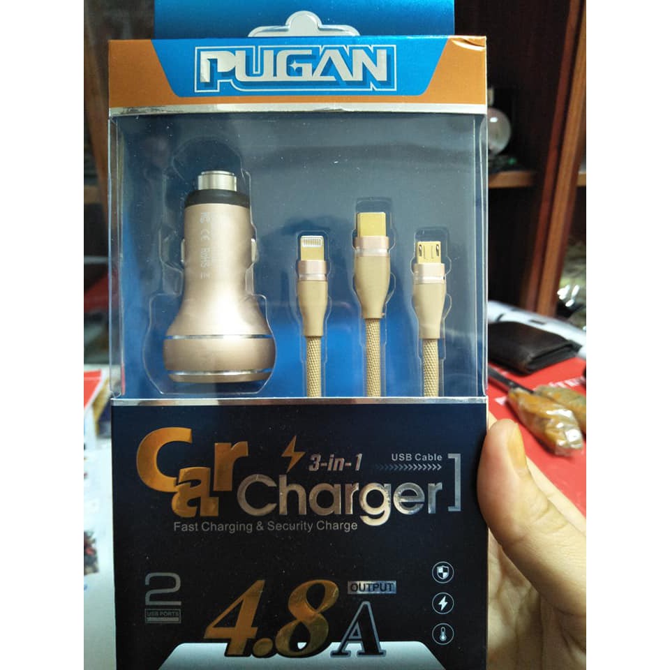 Tẩu Sạc Nhanh Pugan 10A và 4.8A Kèm Dây Sạc 3 Đầu Cho Các Loại Điện Thoại Dùng Trên Ô Tô