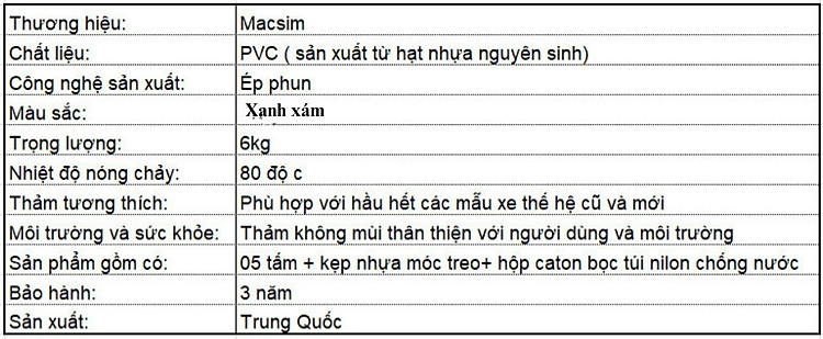 Tấm Thảm lót sàn ô tô đúc khuôn Macsim được thiết kế dạng khay, sử dụng nhựa nguyên sinh Polyvinyl clorua (PVC) và cao su giúp tăng độ mềm và dẻo dai cho tấm thảm.