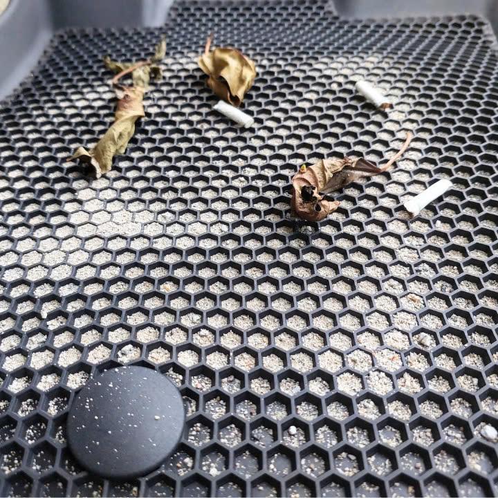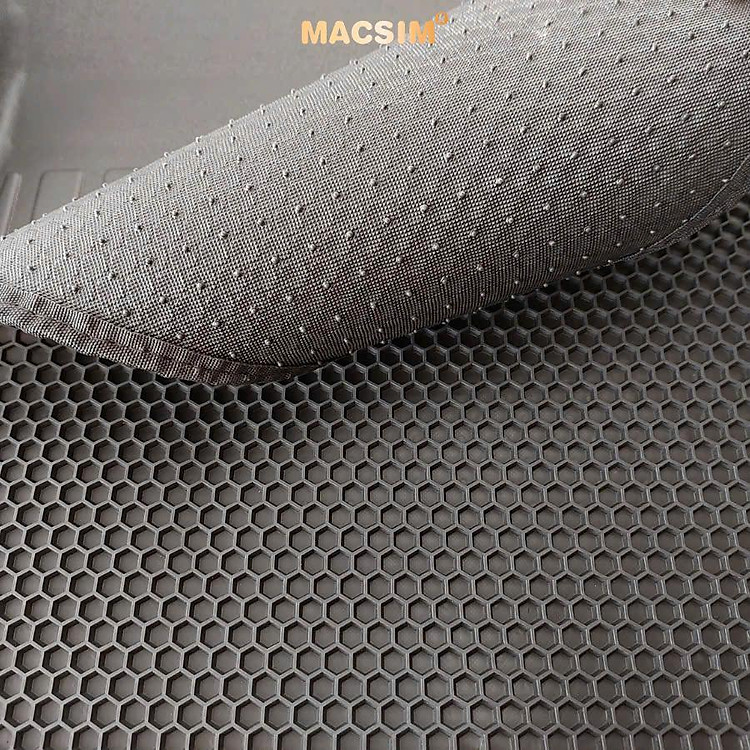 -Lớp 2 – Thảm dạng lưới lục giác màu đen giấu bụi bằng cao su PBR (Polybutadiene Rubber): Chất liệu cao su PBR dẻo dai, độ đàn hồi cao, chống mài mòn cực tốt, không mùi, thân thiện với môi trường và sức khỏe. Thiết kế tổ ong 3D thông minh giúp giấu bụi, giữ lại rác và đất cát mà không bị lộ ra ngoài. Khả năng bám sàn tốt, giúp thảm không bị xô lệch khi sử dụng. Có thể tháo rời dễ dàng để vệ sinh riêng, giữ cho lớp dưới luôn sạch sẽ.