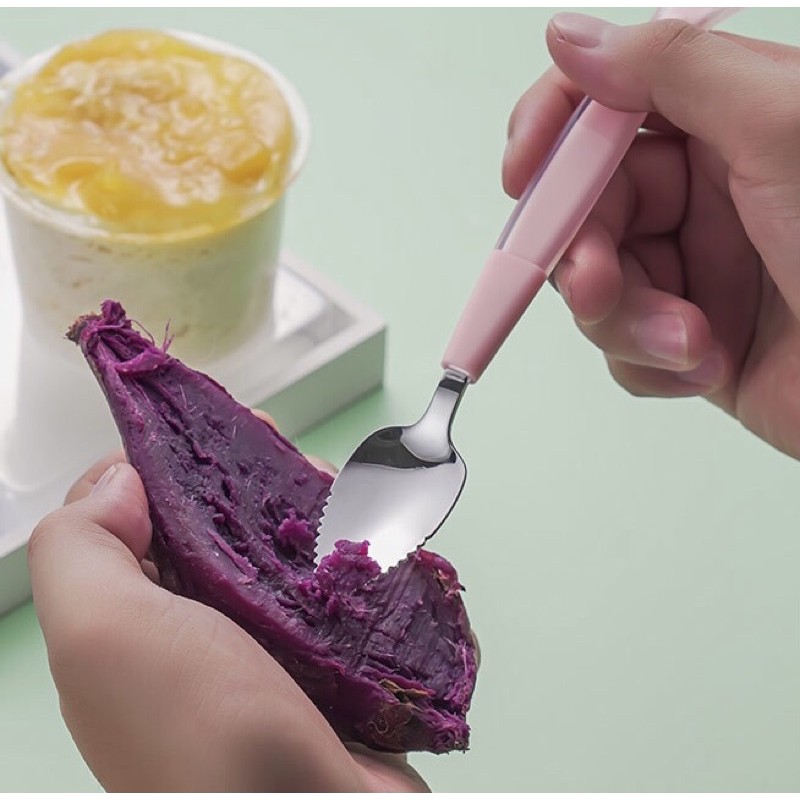 Mặc dù thìa đầu inox có lưỡi răng cưa nhưng không gây nguy hiểm như dao kéo, lưỡi răng chỉ dài 2mm, và đầu thìa bo tròn, nên nếu bé không ăn hết miếng trái cây, người lớn như anh chị, bố mẹ bé có thể dùng đầu này để xúc như thìa bình thường.