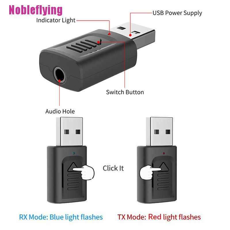 *******************************Welcome to our Nobleflying************************************Features: -Transmitter Mode (TX): Wirelessly transfer audio from your non-Bluetooth TV, home stereo system, or CD player to your Bluetooth headphones or speakers. -PC Audio Transmitter Mode: Wirelessly transfer audio from the PC, notebook to Bluetooth headset or speaker through USB port, no audio cable is required. -Receiver Mode (RX): Wirelessly transfer audio from your Bluetooth-enabled phone, tablet, or computer toyour wired stereo, speakers, or headphones. -This portable, lightweight wireless audio transmitter and receiver is the ideal wireless audio solution for every situation and application, and can be used with computers, mobile phones, televisions, home speakers, and car speakers. Use the latest Bluetooth 5.0 technology, fast transmission speed, high-quality stereo music, enjoy the convenience of Bluetooth technology for life.
