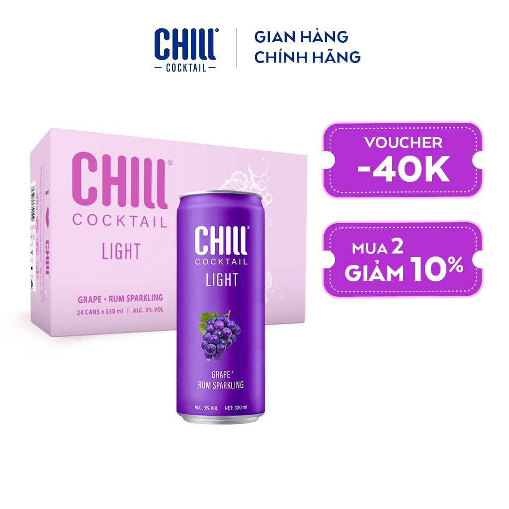 Thực phẩm và đồ uống > Đồ uống > Nước trái cây lên men || [Mã BMBAU300 giảm 7% tối đa 300K đơn 499K] Thùng 24 lon Chill Cocktail Light vị Grape Rum Sparkling 330ml/lon