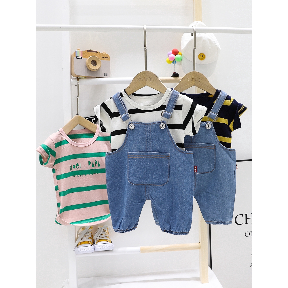 Giới thiệu Bộ trang phục 2 món gồm áo cotton ngắn tay và quần denim xinh xắn cho bé trai và bé gái 0-5 tuổi